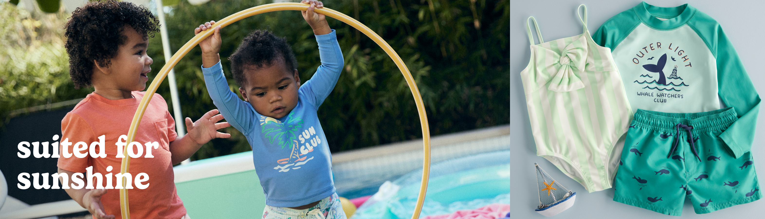 Suit up in bright, family-matching signature prints, trending cutouts on 1 and 2-piece swimwear plus new, above-the-knee fits on swim trunks. With quick-drying fabrics, easy snaps and even full-zip rashguards for baby, on and off is easier than ever.